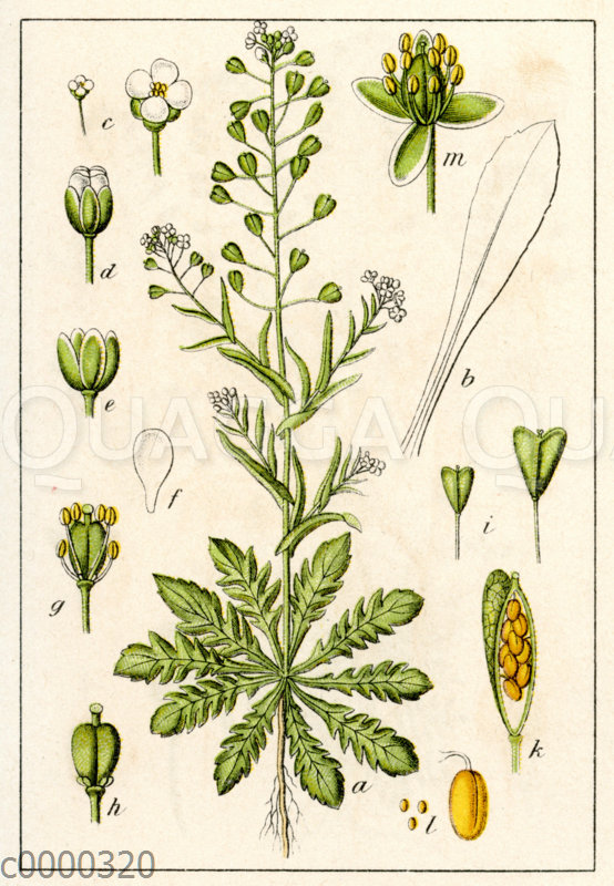 Hirtentäschel: Zeichnung/Illustration/Chromolithographie – Capsella bursa-pastoris – shepherd’s purse – bourse à pasteur_ molette à berger_ capselle_ bourse de capucin_ bourse de Juda_ moutarde de Mithriade_ bourse-à-berger