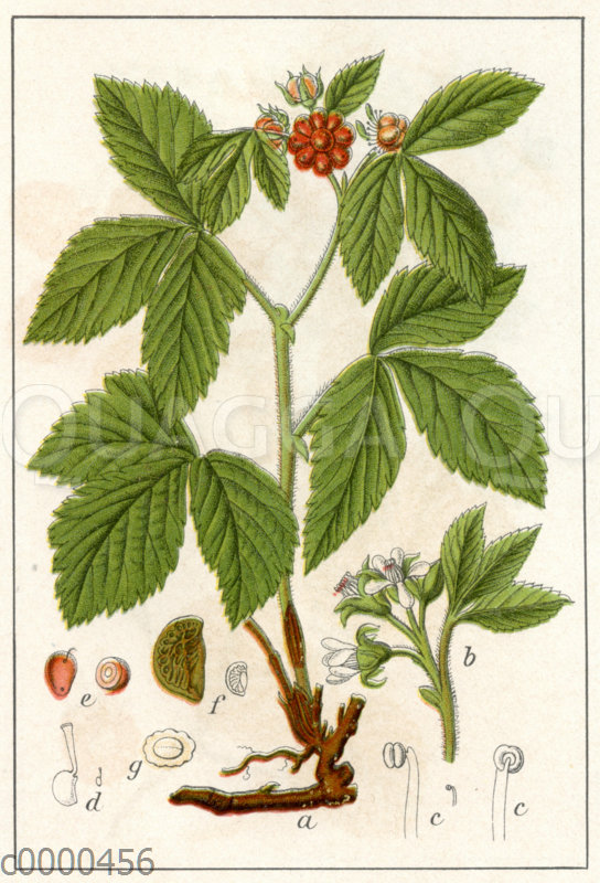 Steinbeere: Zeichnung/Illustration/Chromolithographie – Rubus saxatilis – –