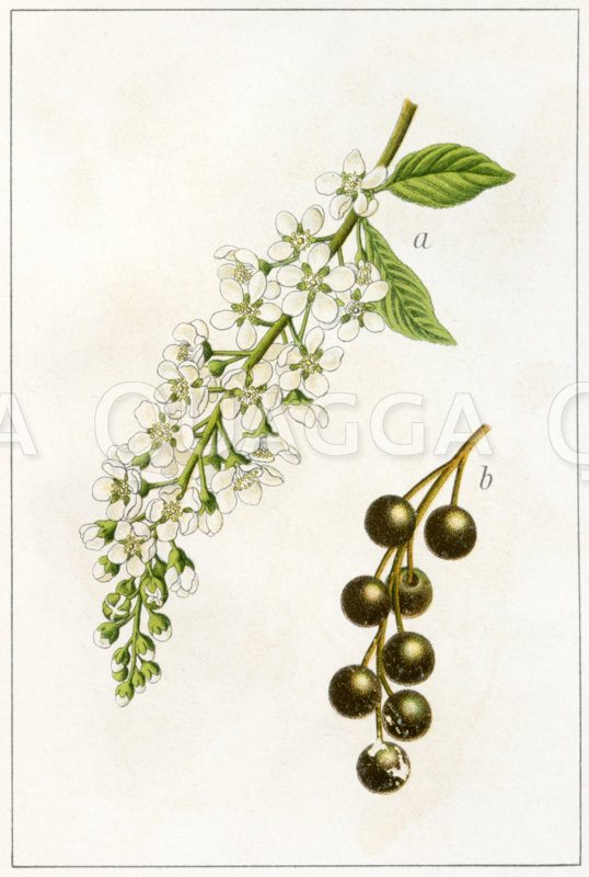 Traubenkirsche, Ahlkirsche: Zeichnung/Illustration/Chromolithographie – Prunus padus Syn. Padus avium, Padus racemosa – bird cherry – Cerisier à grappes