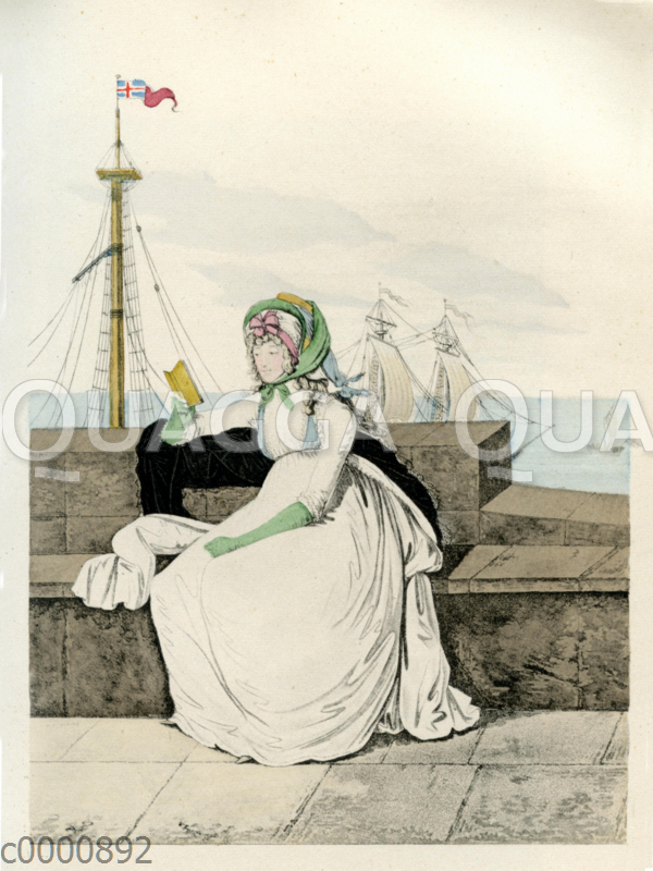 Damenmode um 1795: Zeichnung/Illustration/Photochromie – – Women’s fashion around 1795: Lady with a book on the wharf, Gallery of fashion, London, 1795 – Mode féminine vers 1795: Dame avec un livre sur le quai, Galerie de mode, Londres, 1795