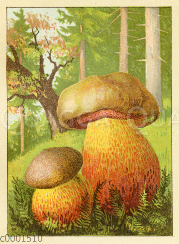 Satanspilz: Zeichnung/Illustration/Chromolithographie – Rubroboletus satanas Syn. Boletus satanus – Satan’s bolete or the Devil’s bolete – Bolet Satan