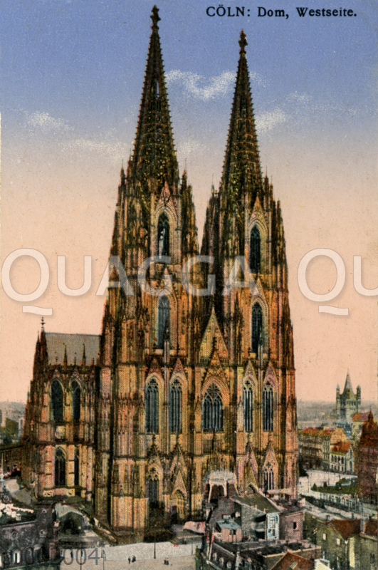 Kölner Dom, Westseite: Zeichnung/Illustration/Rasterdruck farbig, entrastert – – Cologne Cathedral, west side – Cathédrale de Cologne, côté ouest
