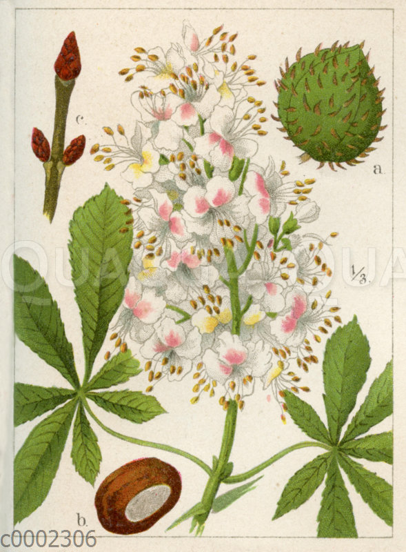 Rosskastanie: Zeichnung/Illustration/Chromolithographie – Aesculus hippocastanum – horse-chestnut, conker tree (Aesculus hippocastanum) – marronnier commun (Aesculus hippocastanum)