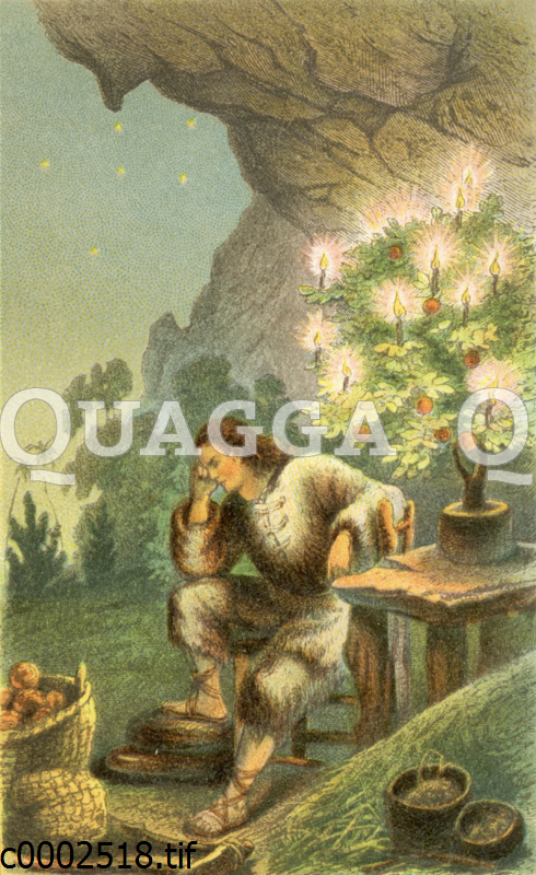 Robinson und sein Christbaum: Zeichnung/Illustration/Chromolithographie – – Robinson and his Christmas tree – Robinson et son sapin de Noël