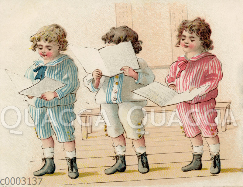 Drei Jungen im Matrosenanzug singen: Zeichnung/Illustration/Chromolithographie – – Three boys in a sailor suit singing –