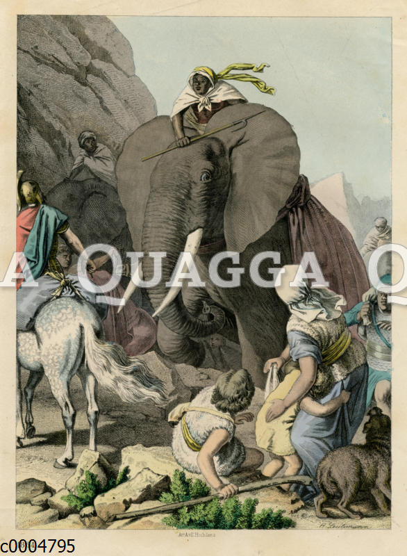 Hannibal überwindet die Alpen mit seinen Elefanten: Zeichnung/Illustration/Holzstich, koloriert – – Hannibal conquering the Alps with his elephants – Hannibal et ses hommes traversant les Alpes.