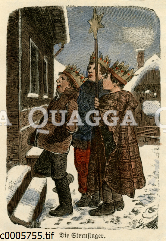 Sternsinger: Drei Jungen als drei heiligen Könige: Zeichnung/Illustration/Farbholzstich – – –