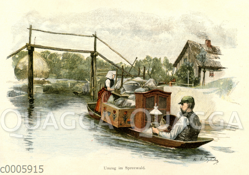 Umzug im Spreewald mit einem Spreewaldkahn: Zeichnung/Illustration/Farbholzstich – – Move in the Spreewald with a Spreewald barge – Se déplacer dans le Spreewald avec une péniche Spreewald
