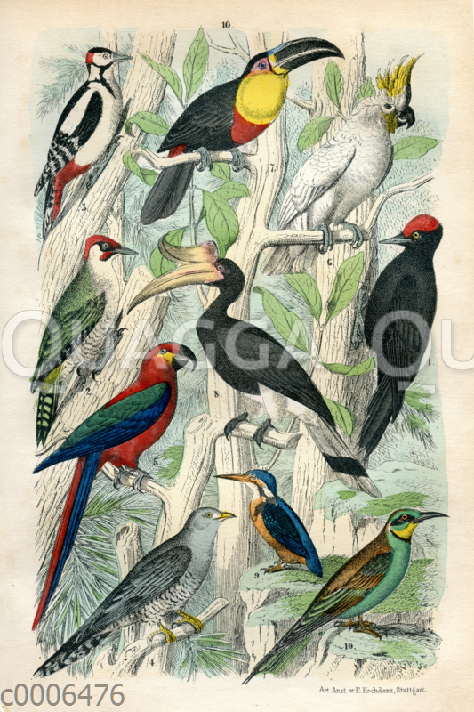 1 Schwarzspecht, 2 Grünspecht, 3 Buntspecht, 4 Kuckuck, 5. Blauer Ara_ 6. Kakadu, 7. Gelbkehliger Tukan, 8. Nashornvogel, 9. Eisvogel, 10. Bienenfresser: Zeichnung/Illustration/Farbholzstich – – 1 black woodpecker, 2 green woodpecker, 3 great spotted woodpecker, 4 cuckoo, 5. blue macaw_ 6. Cockatoo, 7. Yellow-throated toucan, 8. Hornbill, 9. Kingfisher, 10. Bee-eater – 1 pic noir, 2 pic vert, 3 grand pic épeiche, 4 coucou, 5. ara bleu_ 6. Cacatoès, 7. Toucan à gorge jaune, 8. Calao, 9. Martin-pêcheur, 10. Guêpier d’Europe