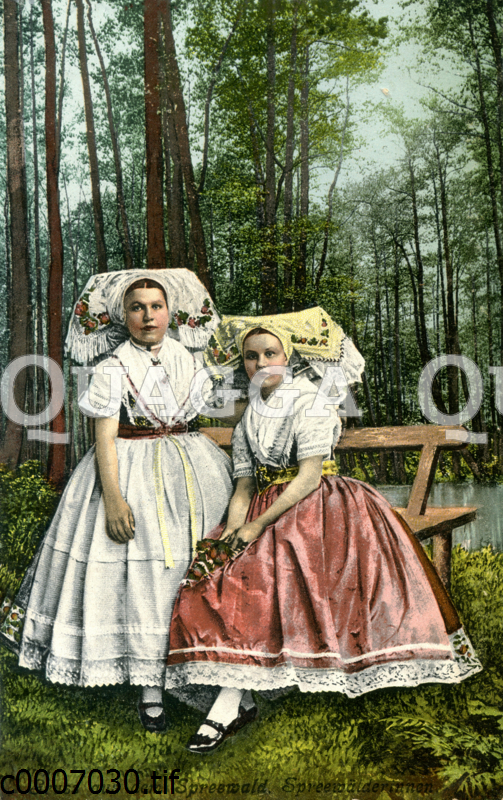 Spreewälderinnen: Zeichnung/Illustration/Photochromie – – Spreewald women in costume – Spreewälderinnen en costume