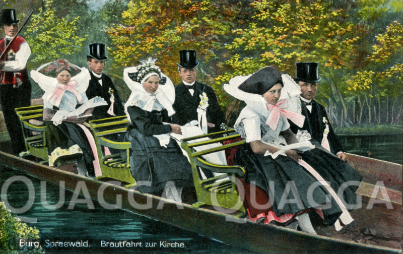 Spreewald; Brautfahrt; Spreewaldkahn; Bride; Groom; costume; Cylinder; hat; Postcard; Wedding; marry, Spreewald; Brautfahrt; Spreewaldkahn; mariée; Groom; costume; cylindre; chapeau; carte postale; Carte postale; mariage; marier