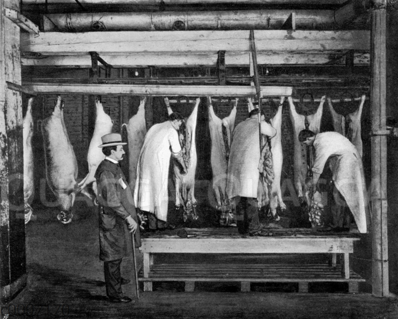 Das Aufschneiden und Ausnehmen der Schweine unter Aufsicht eines Staatsbeamten: Zeichnung/Illustration/ – – –