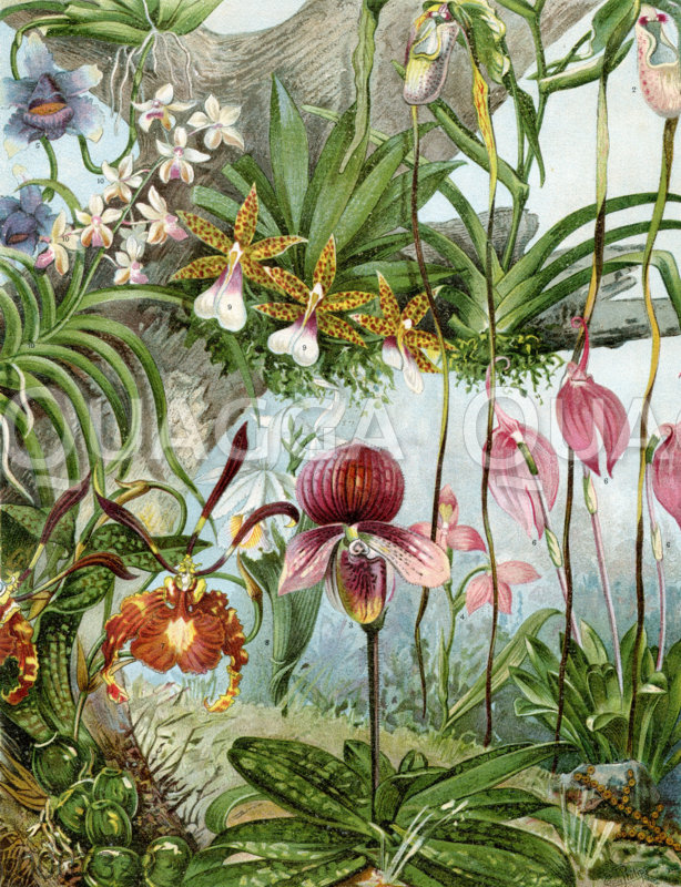 Orchideen-Arten: Zeichnung/Illustration/ – – 1. Bulbophyllum miniutssinrum, 2. Cypripedium caudatum, 3. Cypripeditum tessellatum porphyreum, 4. Disa grandiflora, 5. Huntleya violacea, 6. Masdevallia lindeni grandifolia, Oncidium papilio, 8. Sobralia, liliastrum, 9. Trichocentrum tigrinum splendens, 10. Vanda Boxalli – 1. Bulbophyllum miniutssinrum, 2ème Cypripedium caudatum, 3. Cypripeditim tessellatum porphyreum, 4. Disa grandiflora, 5. Huntleya violacea, 6. Masdevallia Lindeni grandifolia, Oncidium Papilio, 8. Sobralia, liliastrum 9 Trichocentrcm tigrinum splendens, 10. Vanda Boxalli