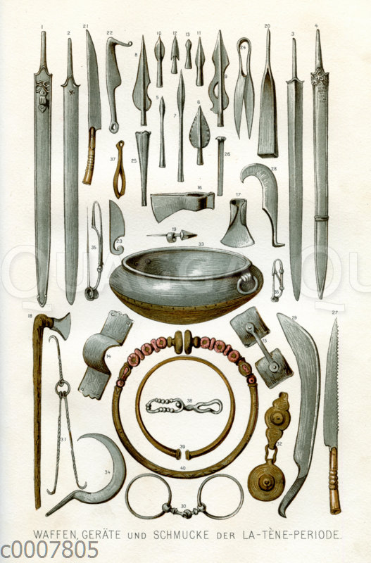 Latènezeit; La Tene period; Iron Age; Weapons; Equipment; Jewellery; Ax; Knife; Sword; Sickle; Dagger; Scissors; ax, Latènezeit; La Tène; Âge du fer; armes; appareils; bijoux; Beil; couteau; épée; faucille; poignard; ciseaux; hache