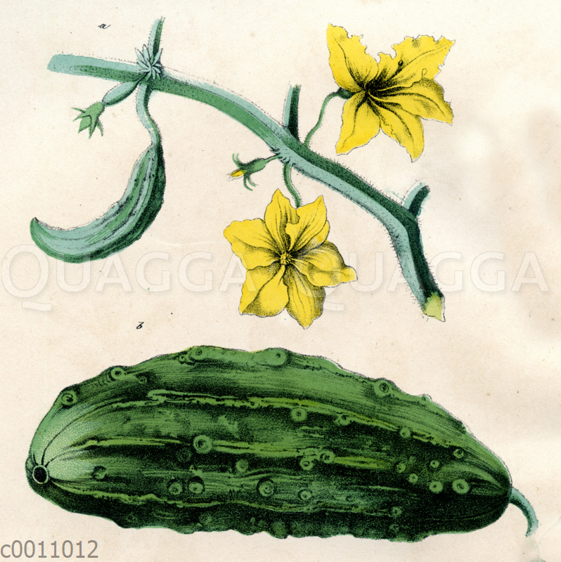 Gurke: Zeichnung/Illustration/Chromolithographie – Cucumis sativus – –