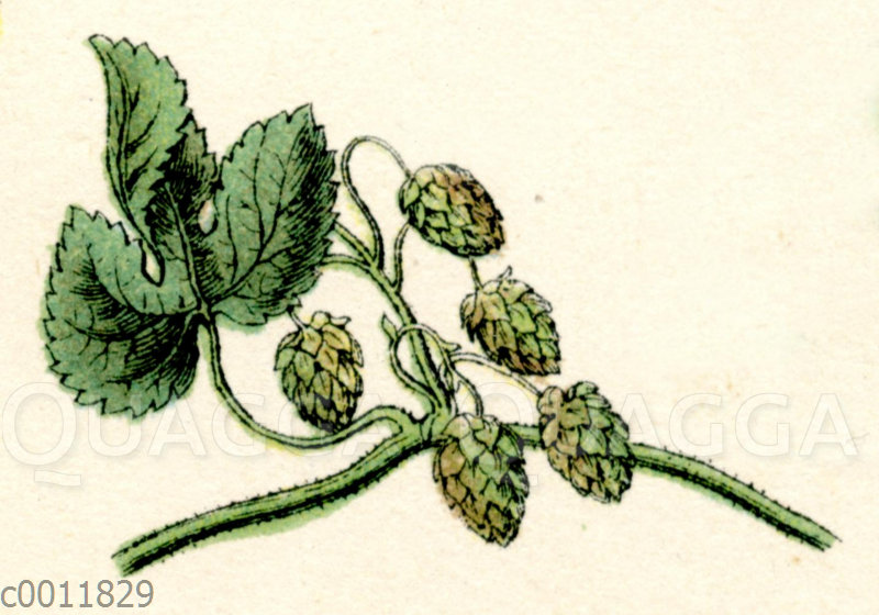 Hopfen: Zeichnung/Illustration/Chromolithographie – Humulus lupulus – common hop or hops – houblon ou houblon grimpant