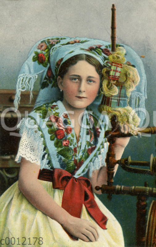 Mädchen in der Tracht des Spreewalds mit Spinnrad: Zeichnung/Illustration/Rasterdruck farbig – – Girl in the costume of the Spreewald with spinning wheel – Fille en costume du Spreewald avec roulette.