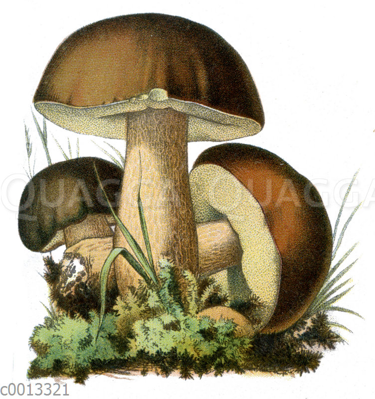 Steinpilz: Zeichnung/Illustration/Chromolithographie – Boletus edulis – penny bun, cep, porcino or porcini – Boletus edulis ou Cèpe de Bordeaux, bolet comestible