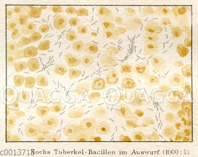 Kochs Tuberkel-Bazillen im Auswurf: Zeichnung/Illustration/ – – Koch’s tubercle bacteria in the sputum of a patient under the microscope (1000: 1). –