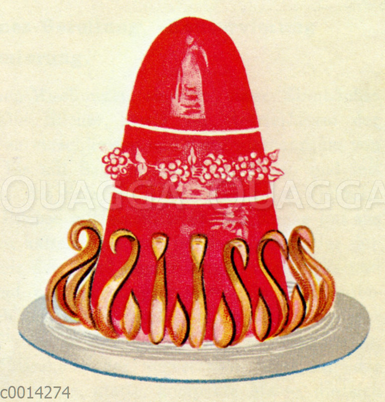 Gestürzte Süßspeise, Eisbombe: Zeichnung/Illustration/Rasterdruck farbig, entrastert – – Dessert, ice cream bomb – Dessert, bombe à glace