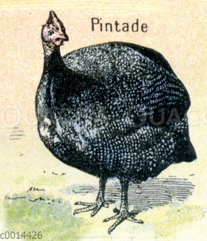 Perlhuhn, Helmperlhuhn: Zeichnung/Illustration/Chromolithographie – Numida meleagris – Helmeted guineafowl – Pintade