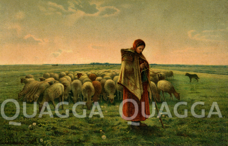 Strickende Schäferin mit Schafherde: Zeichnung/Illustration/Chromolithographie – – Knitting shepherdess with flock of sheep – Bergère tricoteuse avec troupeau de moutons