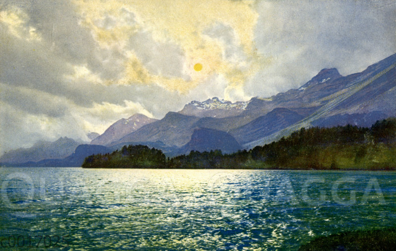 Schweiz, Silsersee, Blick nach Maloja: Zeichnung/Illustration/Photochromie – – Switzerland, Lake Silsersee, view to Maloja, postcard of Nenke and Ostermaier, used 1917 – Suisse, lac Silsersee, vue sur Maloja, carte postale de Nenke et Ostermaier, utilisée en 1917