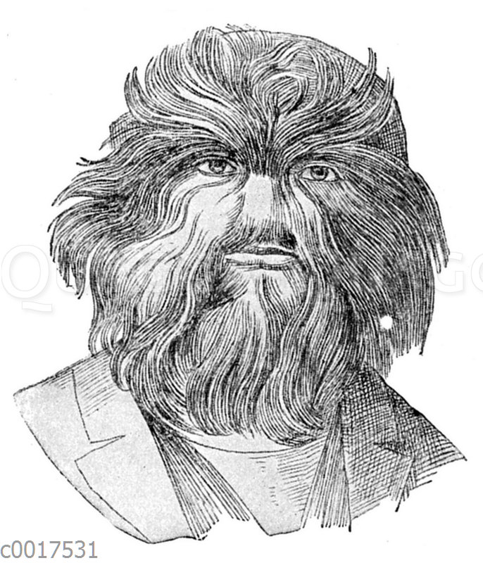 Der russische ‚Haarmensch‘: Zeichnung/Illustration/Rasterdruck schwarz-weiß, entrastert – – –