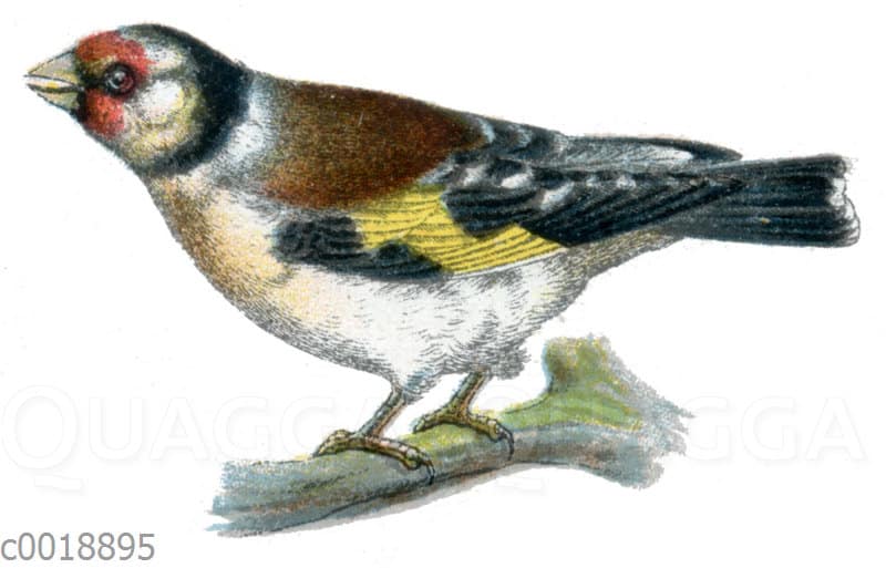 Stieglitz, Distelfink: Zeichnung/Illustration/Chromolithographie – Carduelis carduelis – European goldfinch – Chardonneret élégant