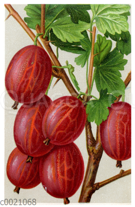 Stachelbeere, Sorte: Rote Preisbeere (Roaring lion): Zeichnung/Illustration/Chromolithographie – – –