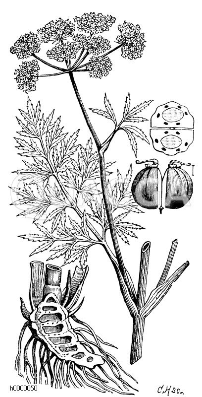 Wasserschierling mit Wurzellängsschnitt: Zeichnung/Illustration/ – Cicuta virosa – Cowbane or Northern Water Hemlock