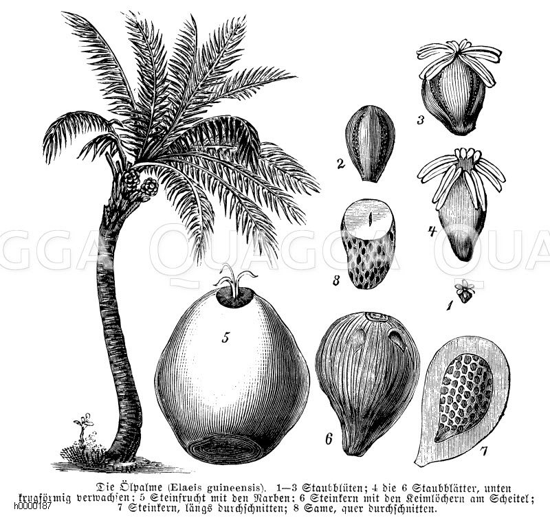 Ölpalme mit Frucht: Zeichnung/Illustration/ – Elaeis guineensis – –