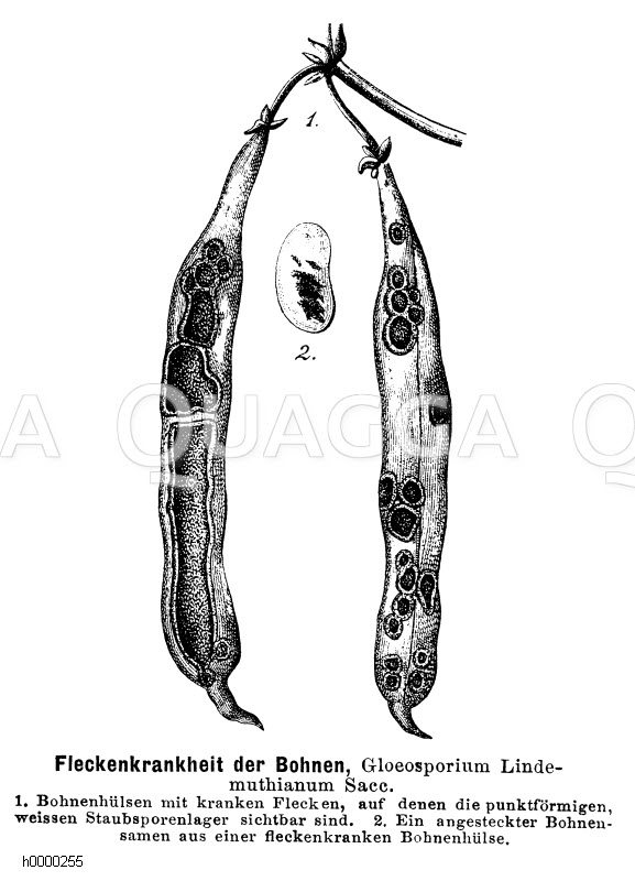 Fleckenkrankheit der Bohne: Zeichnung/Illustration/Holzstich – Gloeosporium lindemuthianum – –