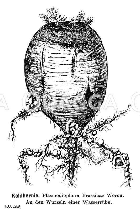 Kohlhernie: Zeichnung/Illustration/Holzstich – Plasmodiophora brassicae – –