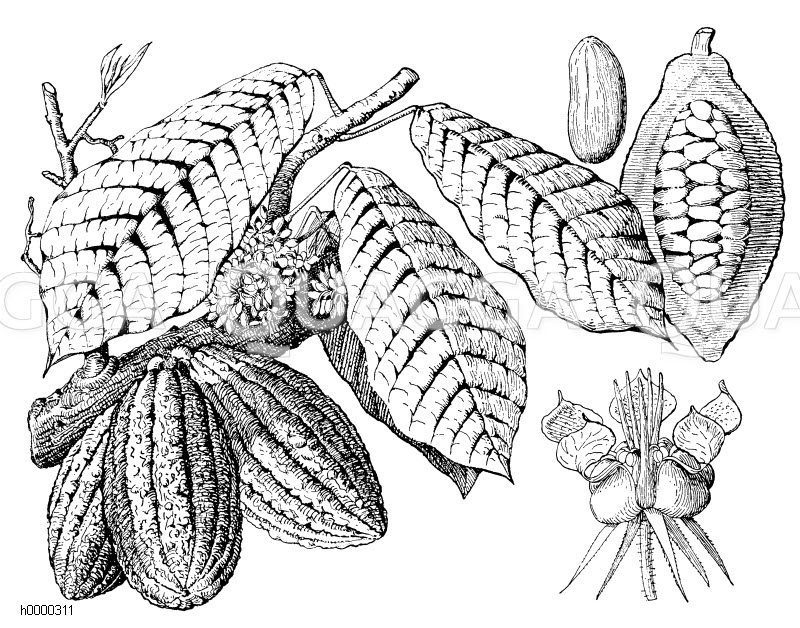Botany; graphic; graphics; woodcut; wood engraving; wood engravings; cocoa; Malvaceae – Mallow; crop; crops; plant; plants; landscape; chocolate; xylograph; botanical; botanical illustration; useful; useful plant,