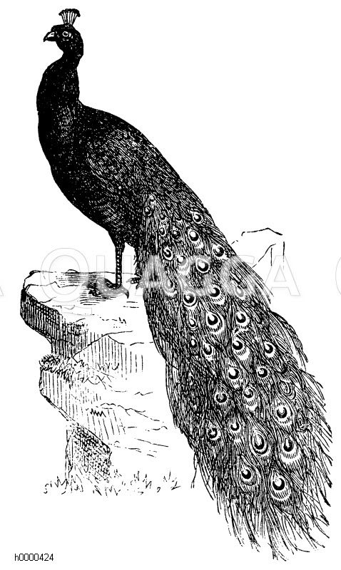 Pfau: Zeichnung/Illustration/Holzstich – Pavo cristatus – Peacock –
