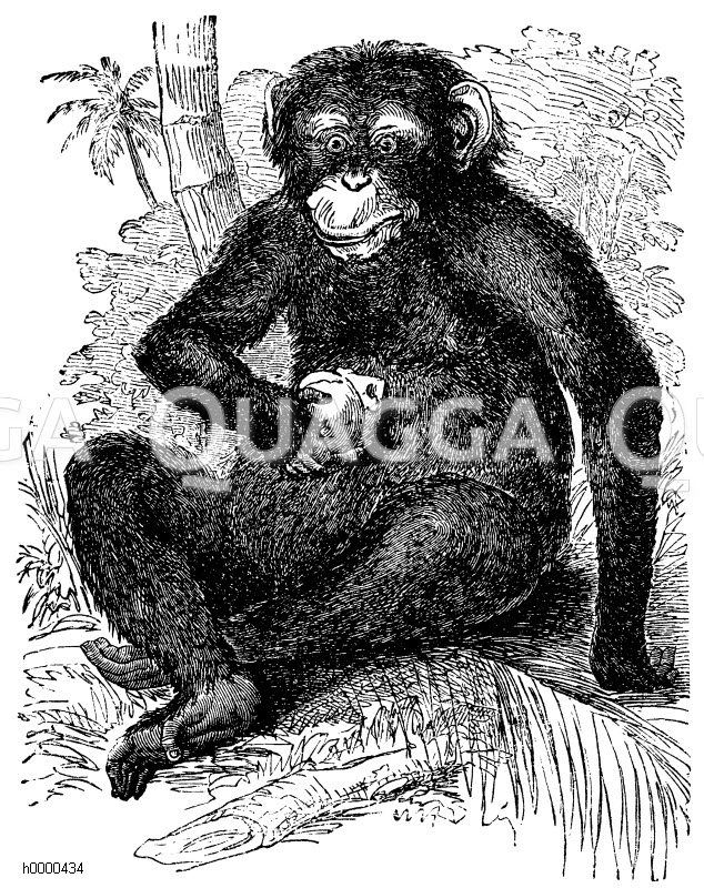 Schimpanse: Zeichnung/Illustration/Holzstich – Pan troglodytes – Chimpanzee – Chimpanze