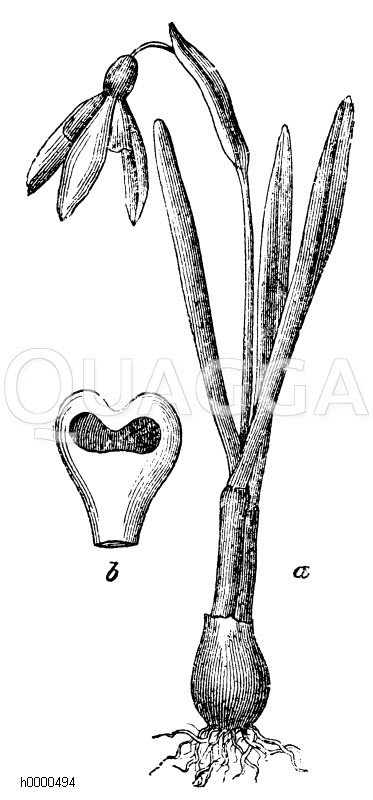 Schneeglöckchen, a Pflanze, b inneres Blütenhüllblatt: Zeichnung/Illustration/Holzstich – Galanthus nivalis – Snowdrop –