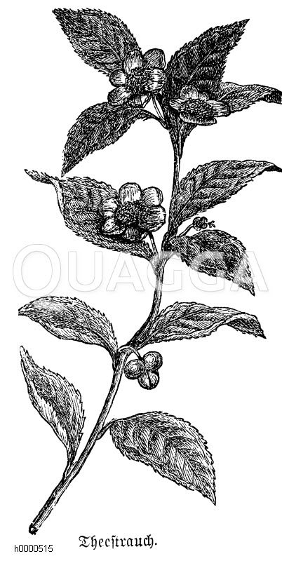 Teestrauch: Zeichnung/Illustration/Holzstich – Camellia sinensis – tea plant – thé