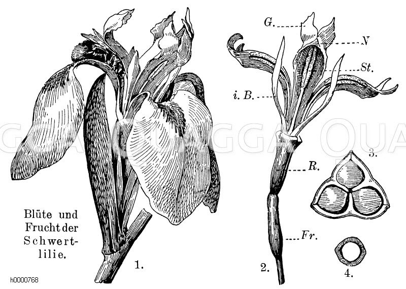 Schwertlilie: 1. von Hummel besuchte Blüte mit Hüllblättern und Lablatt, 2. Blüte nach Entfernung der äußeren Blätter der Blütenhülle. R. Röhre, Fr. Fruchtknoten, i.B. Blätter des inneren Kreises, G. Griffel, St. Staubbeutel, N. Narbe, 3. Frucht, 4. Same: Zeichnung/Illustration/Holzstich – Iris pseudacorus – –