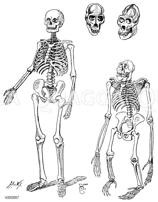 Mensch: Skelett, Gorilla: Skelett und Schädel eines weiblichen (links) und männlichen (rechts) Tieres: Zeichnung/Illustration/Holzstich – Homo sapiens – Man and gorilla: comparison of skeletons and skull of a female (left) and male (right) animal – Homme et gorille : comparaison des squelettes et du crâne d’un animal femelle (à gauche) et mâle (à droite)