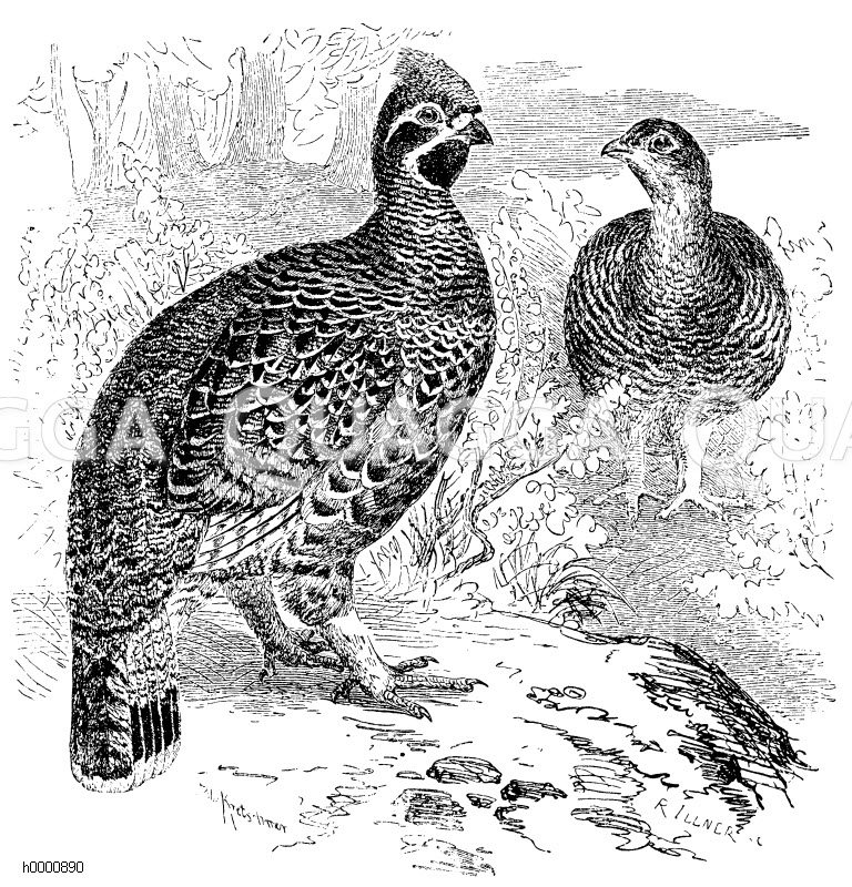 Haselhahn und Haselhenne: Zeichnung/Illustration/Holzstich – – hazel cock and hazel hen –