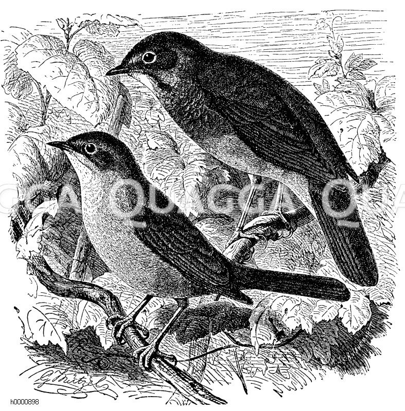 Nachtigall und Sprosser: Zeichnung/Illustration/Holzstich – Luscinia megarhynchos – Nightingale and Thrush Nightingale –