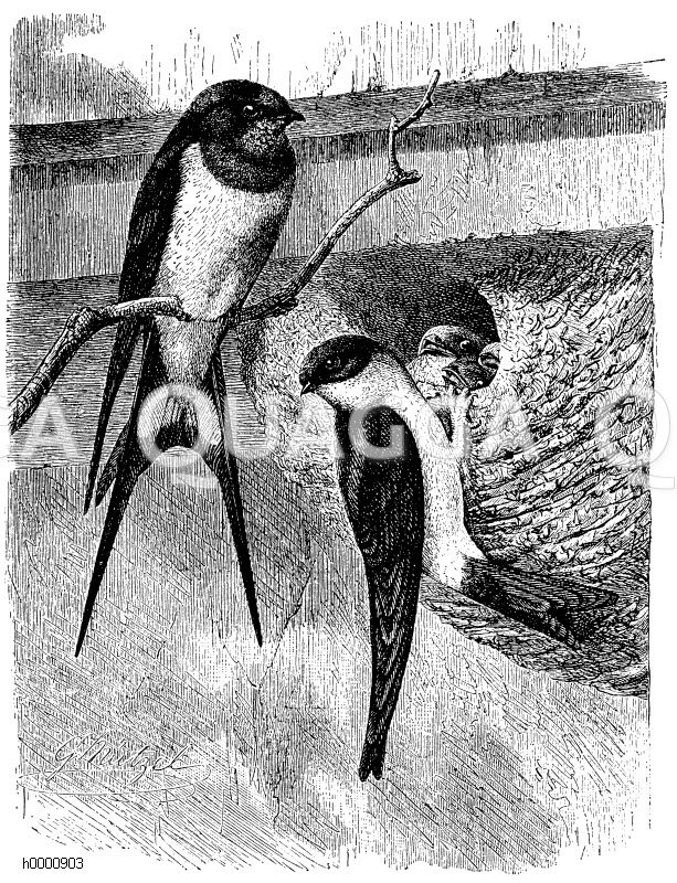 Rauchschwalbe_Rauchschwalbe_Rauchschwalbe: Zeichnung/Illustration/Holzstich – Hirundo rustica_Hirundo rustica_Hirundo rustica – Barn swallow_Barn swallow_Barn swallow, at the nest_, at the nest – Hirondelle rustique_Hirondelle rustique_Hirondelle rustique, au nid_, au nid