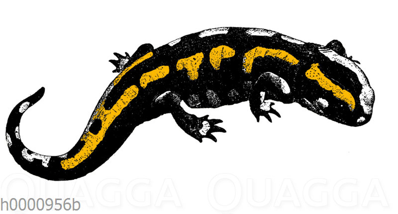 Feuersalamander: Zeichnung/Illustration/Holzstich, nachträglich koloriert – Salamandra salamandra – –