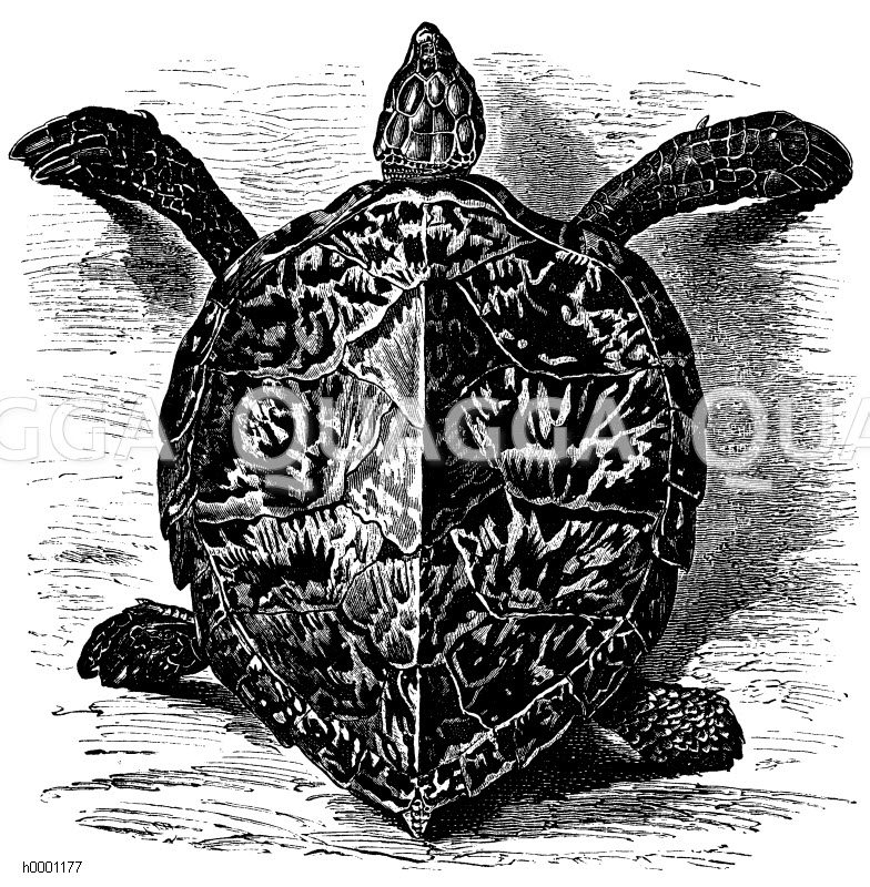 Karettschildkröte: Zeichnung/Illustration/Holzstich – Chelone imbricata – –