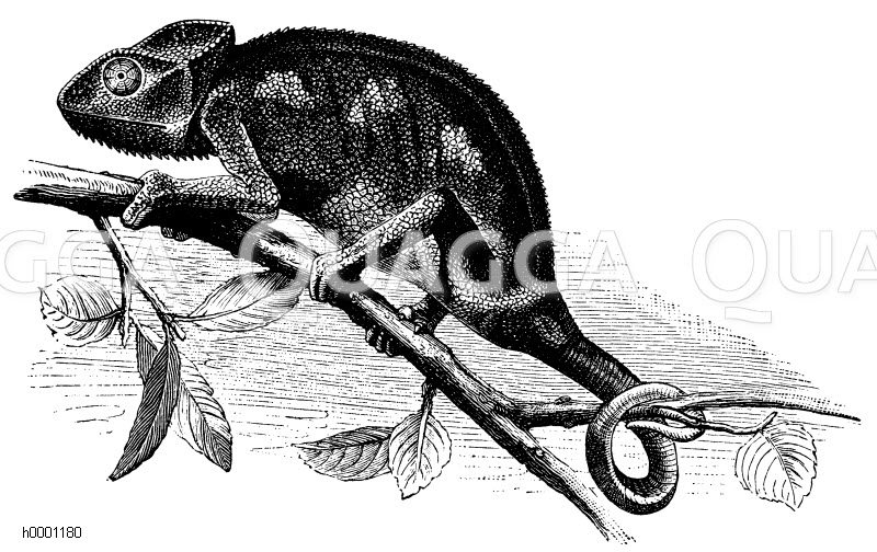 Chamäleon: Zeichnung/Illustration/Holzstich – Chamaeleo chamaeleon – common chameleon – Caméléon commun