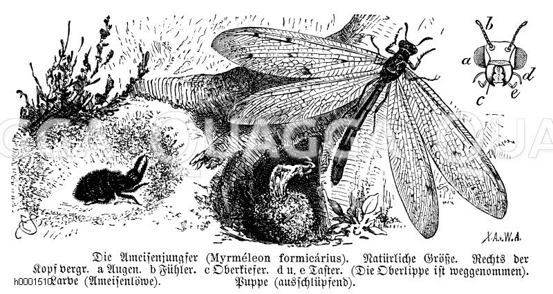 Ameisenlöwe, Ameisenjungfer: Zeichnung/Illustration/Holzstich – Myrmeleon formicarius – Ant lion, antlion –