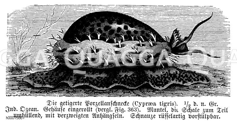 Getigerte Porzellanschnecke: Zeichnung/Illustration/Holzstich – Cypraea tigris – –