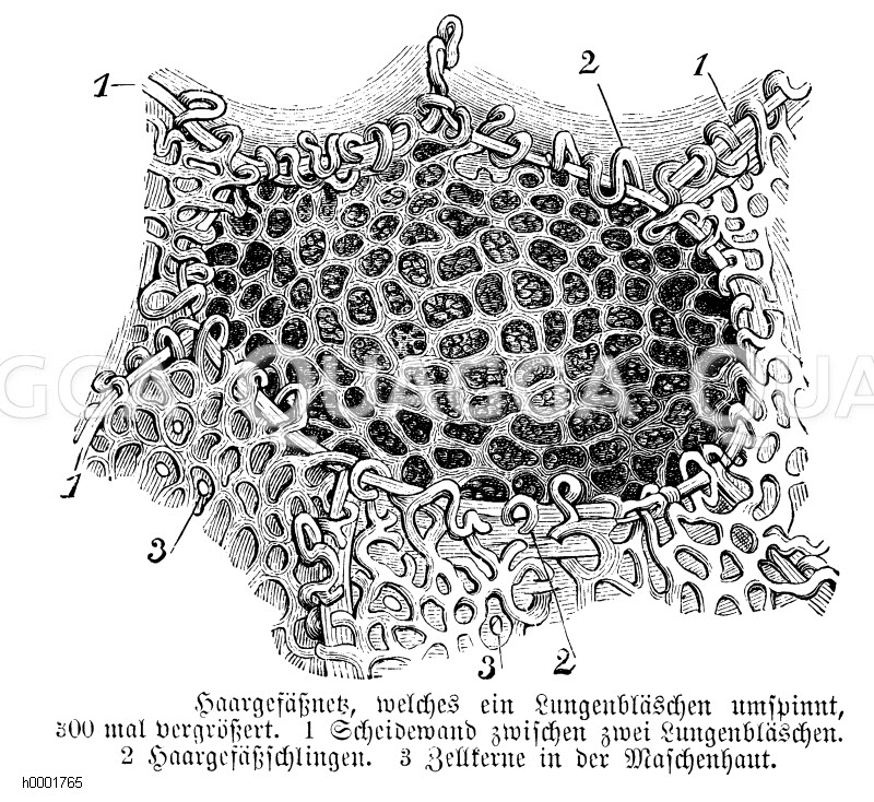 Mensch: Haargefässnetz der Lungen: Zeichnung/Illustration/Holzstich – – Human: Hair vessel network of the lungs – Humain: Haargefässnetz des poumons